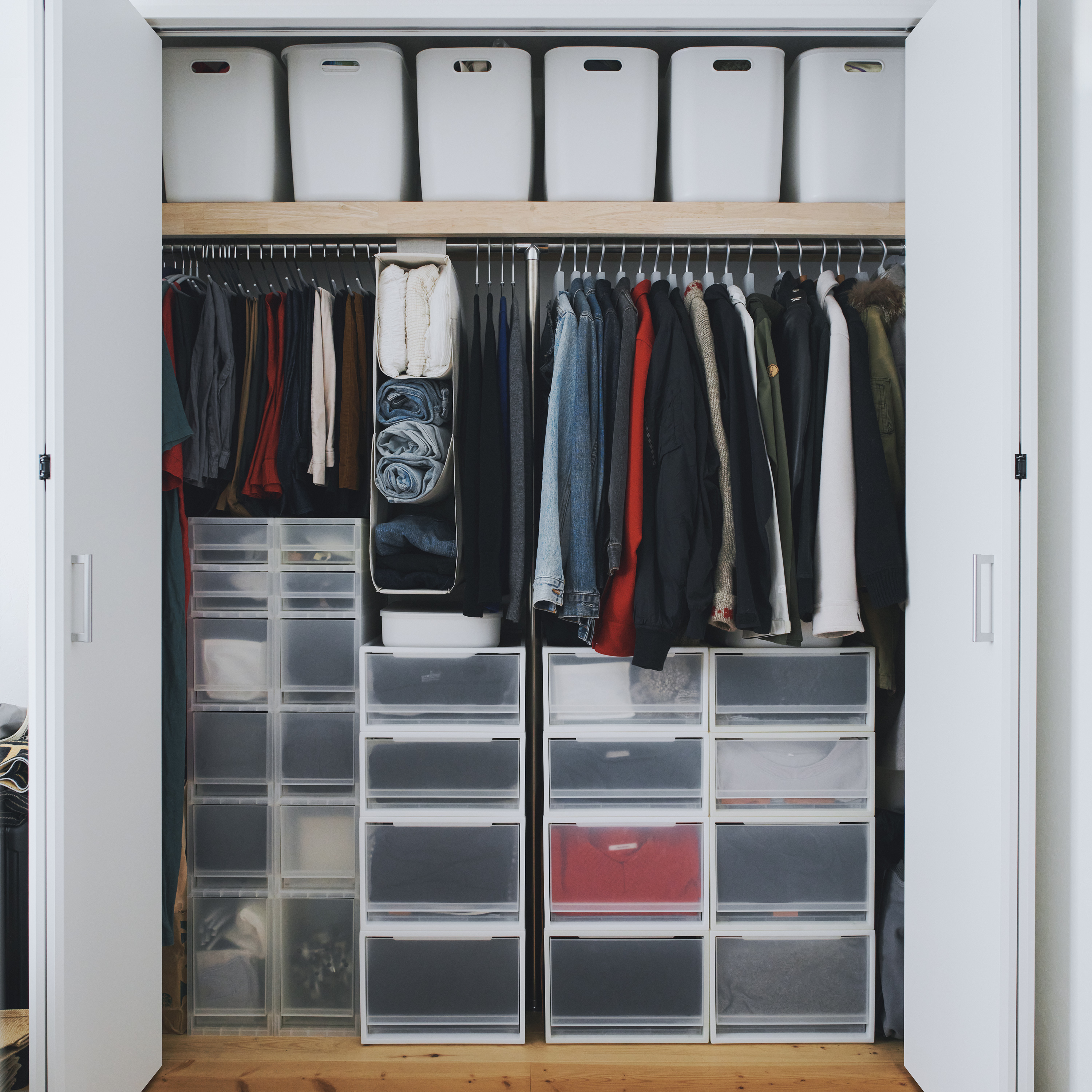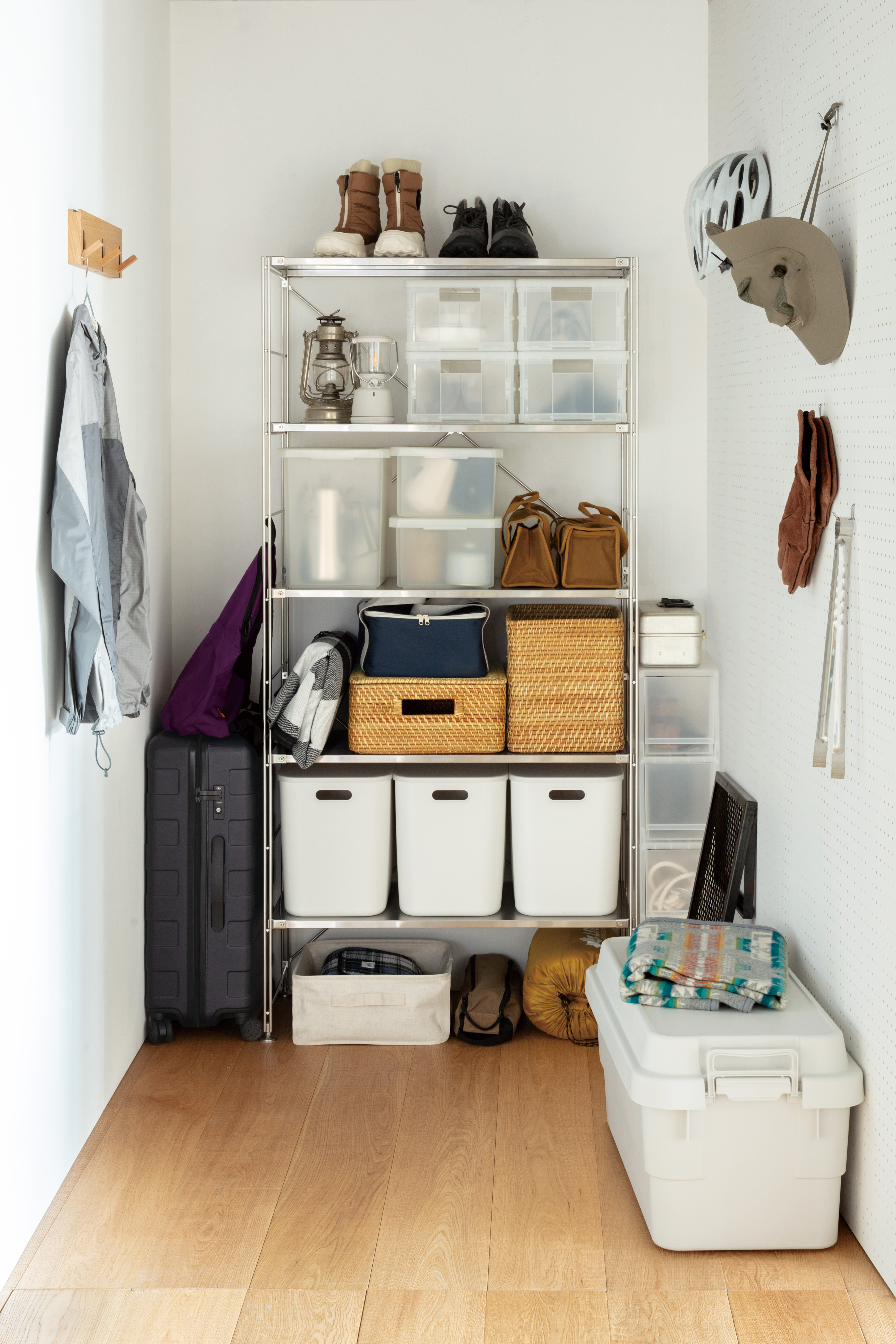若居家空間不適合再添購層架作為收納主體,MUJI無印良品建議可於大門入口附近放置一座玄關衣帽架,讓外套與包包也能各就各位,一目瞭然。同時,針對全家人的外出鞋或室內拖鞋,則推薦鋼製鞋架作為專屬放置空間,不僅能滿足日常自用需求,也方便親友來訪時使用,確保大門出入口整齊有序。